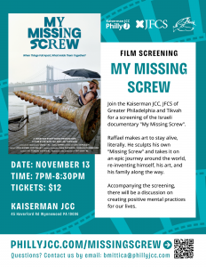 Join Kaiserman JCC, JFCS of Greater Philadelphia, and Tikvah for a screening of the Israeli documentary “My Missing Screw.”